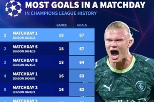 体育资讯10月22日讯 德国转会市场统计了欧冠比赛日的进球数量,并列出榜单,本赛季欧冠联赛阶段首轮比赛出现67粒进球,与2024-2025赛季欧冠第5轮比赛并列最多。
