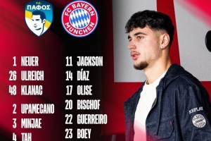 全文摘要:拜仁官方公布欧冠客战帕福斯大名单,凯恩领衔锋线。门将位置诺伊尔、乌尔赖希在列,后防线包括格雷罗与年轻小将博伊。中场方面,基米希、格雷茨卡坐镇,比朔夫入选。格纳布里、杰克逊、路易斯-迪亚斯等前锋悉数在列,球队将全力争胜。