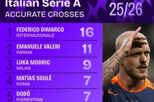 体育资讯9月26日讯 据Squawka的数据统计,本赛季意甲联赛,国米后卫迪马尔科16次精准传中,排名意甲第一,AC米兰中场莫德里奇9次,排名第三。
