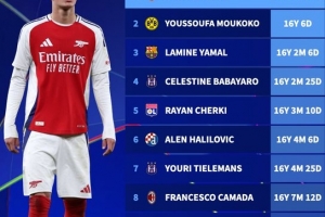 全文摘要:欧冠联赛阶段,阿森纳3-0客胜布拉格斯拉维亚。15岁小将道曼替补登场,以15岁10个月两天的年龄成为欧冠历史最年轻出场球员,刷新了此前由穆科科保持的纪录。