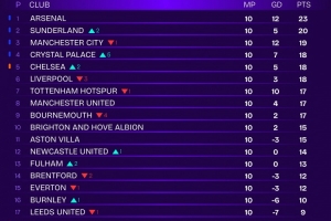 全文摘要:体育数据网站Squawka列出剔除VAR争议判罚后的英超积分榜。结果显示,阿森纳以23分高居榜首,桑德兰20分紧随其后,曼城以19分位列第三。该榜单排除了所有备受争议的VAR判罚影响,为英超联赛提供了一个基于无争议判罚的另类积分排名。