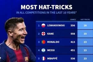 全文摘要:德国转会市场统计了近十年前十联赛球员的戴帽次数。莱万以26次戴帽位居榜首,凯恩以25次紧随其后。C罗、梅西和姆巴佩则同以23次并列第三,哈兰德以21次排名第四。阿圭罗、苏亚雷斯、本耶德尔和奥巴梅扬均以10次戴帽并列第五。