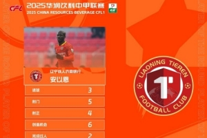 辽宁铁人球员安以恩上演帽子戏法,荣膺中甲第30轮最佳球员。