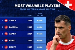 全文摘要:根据德国转会市场数据,瑞士球员历史最高身价排行出炉。扎卡以5000万欧位居榜首,扎卡里亚、阿坎吉以4500万欧并列第二,科贝尔与恩多耶位列第四,均为4000万欧。该榜单反映了瑞士球员近年来的市场价值与出色表现。