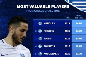 希腊球员历史身价排名:马诺拉斯4500万欧领跑,帕夫利季斯紧随其后
