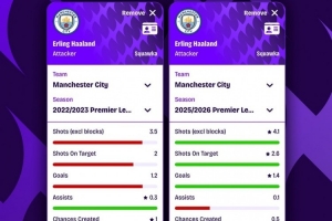 全文摘要:根据Squawka统计,哈兰德本赛季英超数据全面优于上赛季。其每90分钟射门、射正、进球及争顶成功率均有提升,创造机会和助攻则有所下降。总体表现更为高效,进攻火力持续增强。