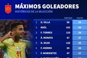 全文摘要:德国转会市场更新西班牙队史射手榜,比利亚以98场59球高居榜首。劳尔、费尔南多·托雷斯、莫拉塔等名将紧随其后。现役球员中,拉莫斯以180场23球并列第10,费兰·托雷斯、奥亚萨瓦尔则分别以23球和22球位列其后。