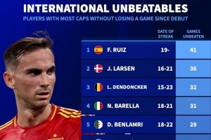 全文摘要:据德国转会市场统计,本世纪球员国家队连续不败场次榜单出炉。西班牙球员法比安·鲁伊斯以41场不败高居榜首,丹麦的拉尔森以36场次之,比利时的登东克尔和意大利的巴雷拉分别以32场和31场位列三、四位。