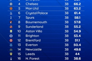 全文摘要:天空体育预测本赛季英超最终排名:阿森纳以78.4分高居榜首夺冠,曼城以72.4分紧随其后。利物浦、切尔西分列第三、四位。曼联排名第五,水晶宫第六。热刺、伯恩茅斯等队依次排位,狼队垫底。