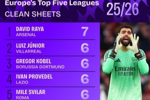 全文摘要:据数据机构squakwa统计,本赛季五大联赛门将零封榜出炉。阿森纳门将拉亚以7场零封高居榜首。紧随其后的有比利亚雷亚尔的儒尼奥尔、多特蒙德的科贝尔等六位门将,均以6场零封并列第二。