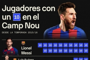全文摘要:根据Sofascore统计,2015-16赛季以来,球员在诺坎普获评10分的场次中,梅西以19场居首。苏亚雷斯与内马尔并列第二,各3场;图兰、姆巴佩、登贝莱和莱万均以1场并列第三。
