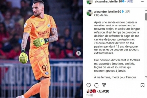 全文摘要:34岁法国门将莱特利尔宣布退役。结束15年职业生涯,他感谢足球带来的美好回忆、家人朋友的支持以及所有曾效力的俱乐部,特别是始于并终于巴黎圣日耳曼。他表示,这并非与足球告别,只是一个篇章的结束,那份热爱将永存心中。