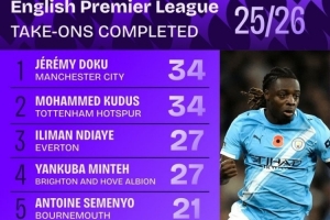 全文摘要:英超11轮战罢,官方统计了成功过人榜。曼城的多库与热刺的库杜斯以34次成功过人并列榜首。埃弗顿的恩迪亚耶与布莱顿的明特以27次并列第三,阿森萨卡等球员也跻身前十。