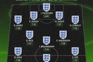 全文摘要:英格兰世预赛8战全胜晋级世界杯。WhoScored评选出最高评分阵容,凯恩以7.96分居首,赖斯(7.47)和萨卡(7.38)紧随其后。该阵容包括门将皮克福德,后卫詹姆斯、孔萨、格伊、奥莱利,中场赖斯、贝林厄姆、埃泽、安德森,以及前锋萨卡与凯恩。