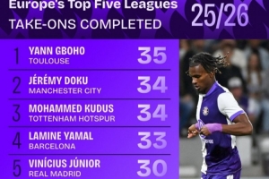 本赛季五大联赛成功过人榜: