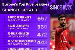 全文摘要:据Squawka统计,自2019-2020赛季以来,B费以创造557次机会位列五大联赛榜首,同期领先德布劳内(530次)与基米希(472次)等球星,展现了其卓越的进攻组织能力。